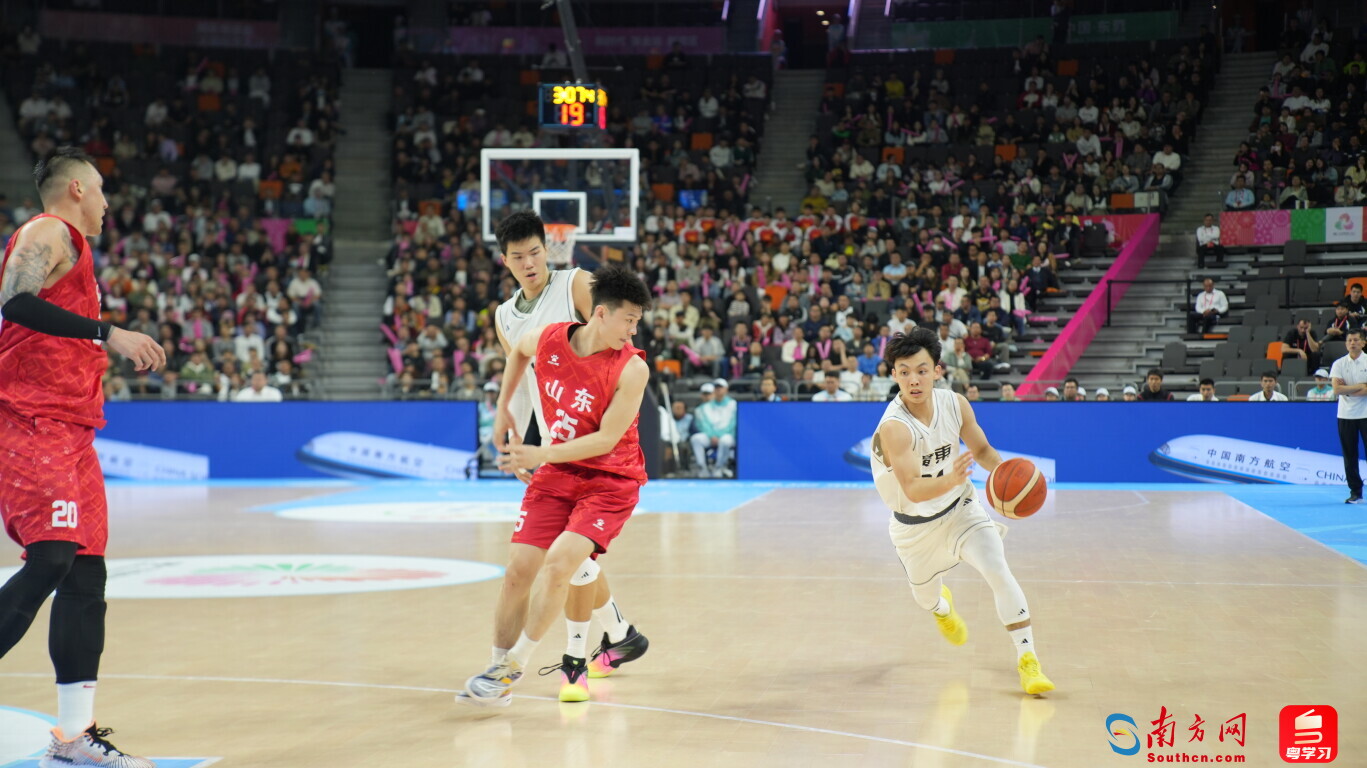11月4日,第十五届全运会成人篮球比赛正式开赛。广东队在东莞篮球中心与山东队进行小组首场比赛。广东队派出主力赵睿、徐杰、胡明轩等球员,主教练杜锋在场边指导。首节比分25-17,广东队暂时领先;第二节,山东队紧追,分差缩小至4分,广东队稍稍领先;第三节广东队及时调整状态,将分差扩大至16分;第四节,广东队追平比分,以87-71锁定胜局。根据赛程,14支参赛球队分为三组:第一组辽宁队、天津队、北京队、澳门队、吉林队;第二组浙江、山东、江苏、广东;第二组我是四川、上海、香港、河南、湖北。三个小组的前两名球队和成绩最好的两个第三名球队将晋级四分之一决赛。淘汰赛将于10日开始,12日决出冠军。广东队下一场比赛将于11月6日迎战江苏队。 南方网、广东研究记者 黄慧石 摄影 张启达 校对 梁杰平