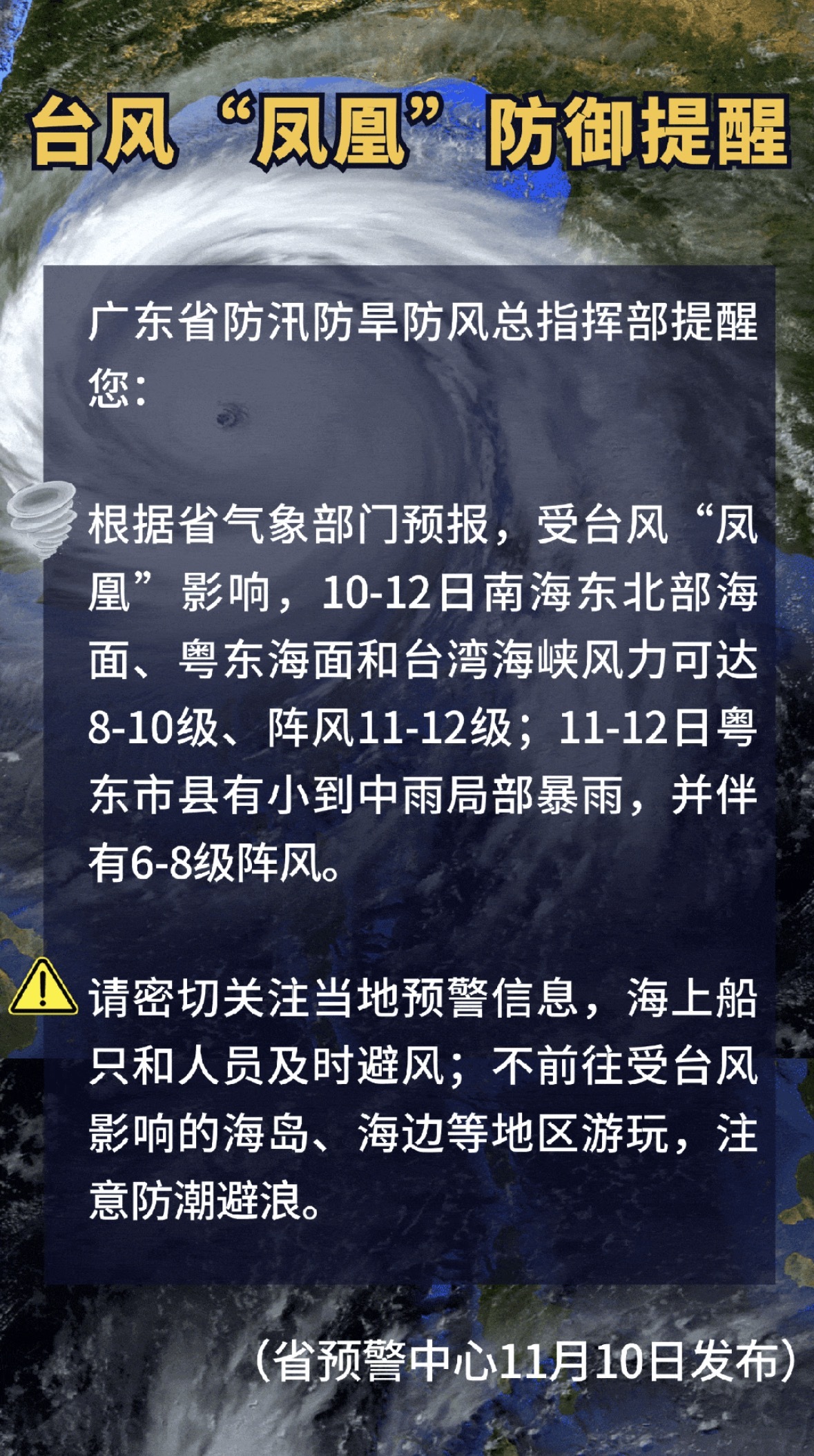 据省气象部门预报,受台风“凤凰”影响,11月10日至12日,南海东北部、粤东海域、台湾海峡风力可能达到8-10级,阵风11-12级; 11日至12日,粤东市县有小到中雨,局地大雨,并伴有阵风6~8级。 10日,广东省防汛抗旱防风指挥部发布台风防御预警,提醒民众关注当地预警信息,海上船舶和人员及时避风;不前往海岛、海岸等受台风影响的地区旅游,注意潮汐和海浪。南方+记者 曾良科 陈伟 通讯员 广东英轩