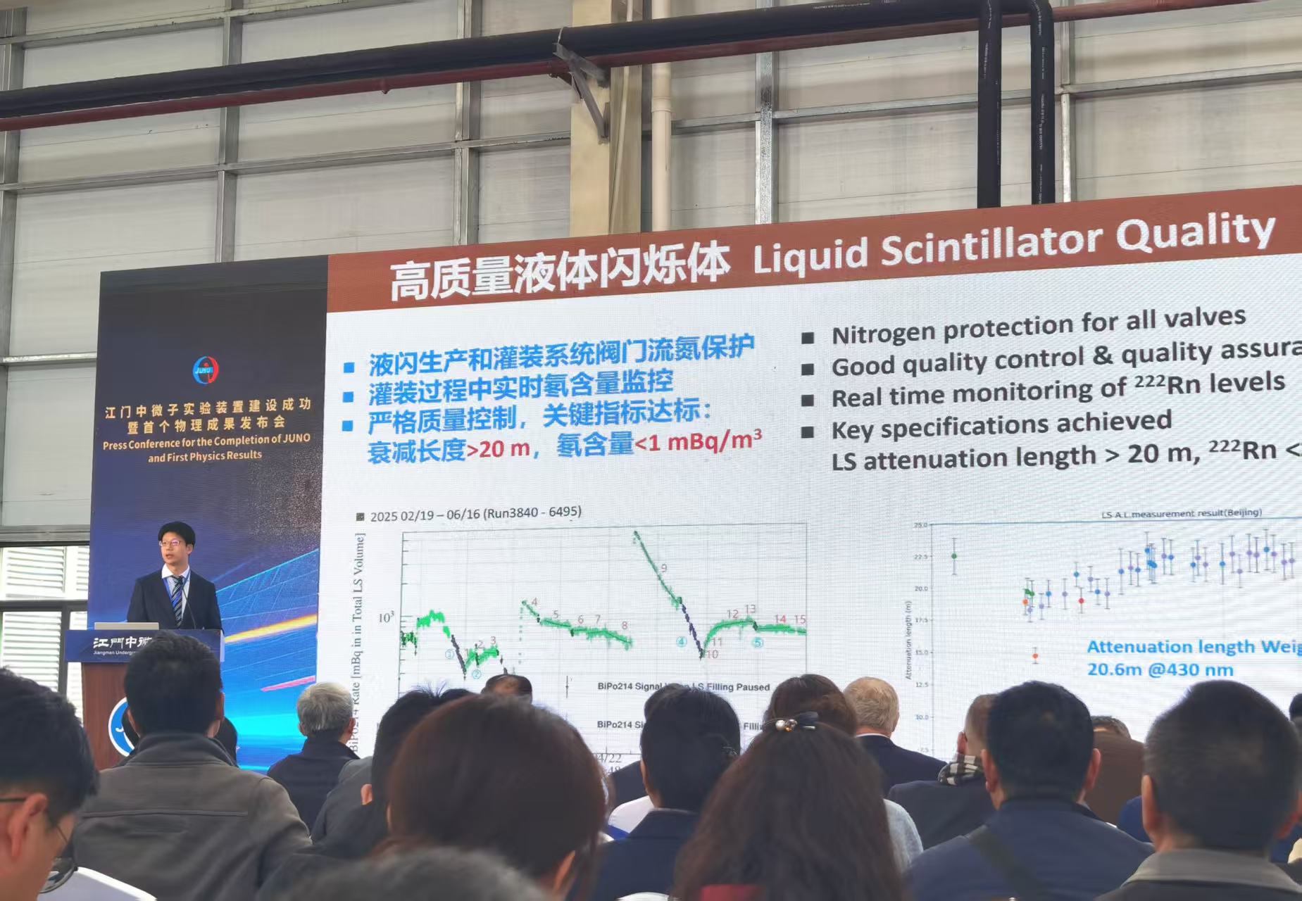 历时59天,完成了对两个中微子振荡参数的最精确测量! 11月19日,中国科学院高能物理研究所在广东江门发布了江门中微子实验(朱诺)成立以来的首个物理成果。记者在会上还获悉,朱诺号有望在五年内完成中微子质量序列测定。精度创历史之最,“太阳中微子偏差”得到证实。朱诺号是中国科学院高能物理研究所牵头的重大国际合作项目。经过十多年的设计和建造,朱诺号成为世界上第一个建成的新一代超大规模、超高精度中微子实验装置。 2025年8月26日,朱诺号完成了lspin闪烁体的注入,并正式开始计数。温良健 高能研究所副所长中国科学院物理所、朱诺合作组物理分析组组长报告了朱诺号在该领域的第一个物理成果。通过分析运行以来近两个月的有效数据,朱诺协作团队测得了被称为“太阳中微子振荡参数”的混合角θ12和平方质量差ΔM221,比以往实验的最佳精度提高了1.5-1.8倍。温良健介绍了朱诺号的建设成果。邹长森摄 中微子振荡间接证明中微子具有非零质量。它是目前超越标准模型的新物理学最清晰、最广泛接受的实验证据。描述中微子振荡的规律可以用六个参数来表达,包括混合角θ12和差值平方ΔM221。这两个参数可以通过太阳中微子和反应堆中微子精确测量。然而,之前的测量两种方法之间的质量平方差不一致,被称为“太阳中微子偏差”,暗示着可能的新物理学。据报道,江门中微子实验通过反应堆中微子证实了这种偏差。未来,只有朱诺号实验能够通过同时测量太阳中微子和反应堆中微子来证实或反驳这种偏见。相关论文于11月18日提交给该期刊,并发表在ARXIV预印本网站上。温良健表示,我朱诺号利用近两个月的实验数据所测得的测量精度超过了其他国际实验十到二十年的积累,这充分体现了实验设备的先进性。测量结果将对中微子质量起源、轻子风味混合矩阵、无中微子双β衰变等研究领域产生重要影响。特别是当这些高精度参数结合宇宙学观测和实验贝塔衰变结果,朱诺号将为多中微子质量和混合的源机制和新物理模型提供前所未有的严格约束,使其成为未来几十年中微子物理和宇宙学交叉研究的下一个实验之一。 “朱诺号在运行过程中获得的第一批数据表明,其探测器的主要性能指标完全达到或超过了设计预期,这表明朱诺号已经做好了开展中微子物理前沿研究的准备。”温良健说道。江门中微子实验项目经理、新闻发言人王一方表示,“江门中微子实验仅用了2个月就完成了如此高精度的测量,表明朱诺号探测器的性能完全符合设计预期。其前所未有的测量精度使我们能够快速确定中微子质量序列。”“因此,测试三种中微子振荡的框架,并寻找超出这个框架的新物理。”中微子质量测序可能在五年内完成,稍后将探测到绝对质量。JUNO由中国科学院高能物理研究所于2008年提出,并得到了国际合作组多个国家的认可和资金支持。在地下实验大厅的一个直径41.1米的深水池中间,有一个线圈,以及光分离板,共同构建了超高灵敏度中微子探测系统,在世界范围内完成中微子序列设计,使用寿命为30年。