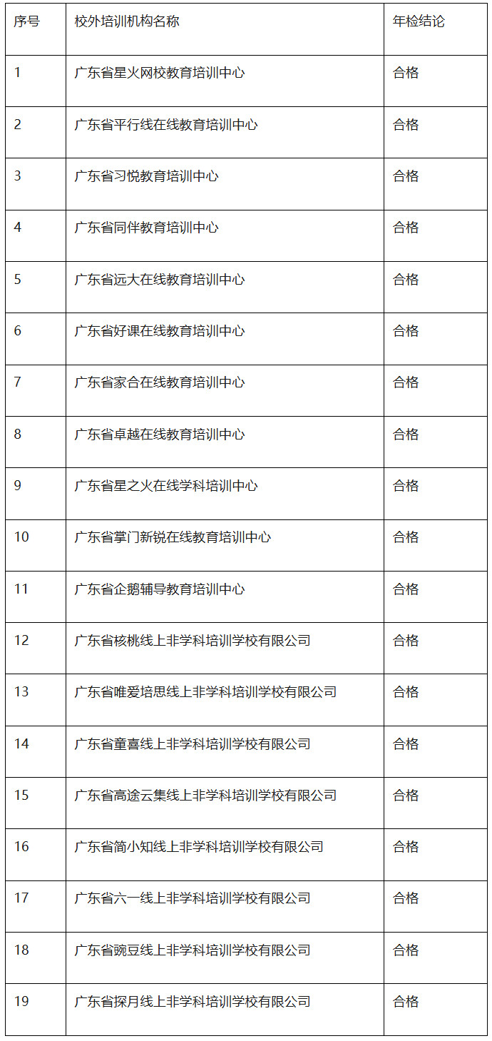 按照《广东省在线培训机构2024年年度检查工作方案》要求,省教育厅组织开展了年度材料审核、专家评审、现场核查等工作,形成了2024年年度检查结论,现予以公布。附件:广东省校外在线培训机构 2024 年年度检查结论 广东省教育厅 2025 年 11 月 21 日 附件:广东省校外在线培训机构 2024 年年度检查结论 注:目前我省已核准校外在线培训机构 22 家。除上述19家机构外,另外3家无纪律校外在线培训机构(广东星火在线无纪律培训学校有限公司、广东源立在线无纪律培训学校有限公司、年年此时检查结论。